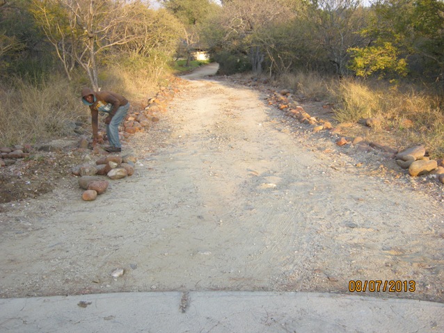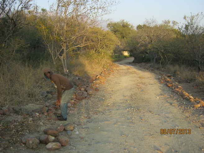 In the rainy season, where it sometimes pores down, water in big quantities was running down the driveway and onto the front yard of the house where it created problems. The solution was to make a drain following the left hand side of the driveway to collect water running off from the bush and to dig drains crossing the driveway so the water can be led into the bush on the right hand side of the driveway and away from the house.